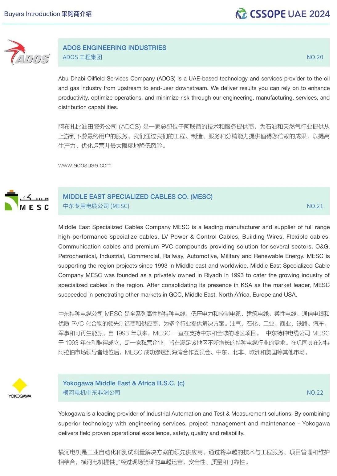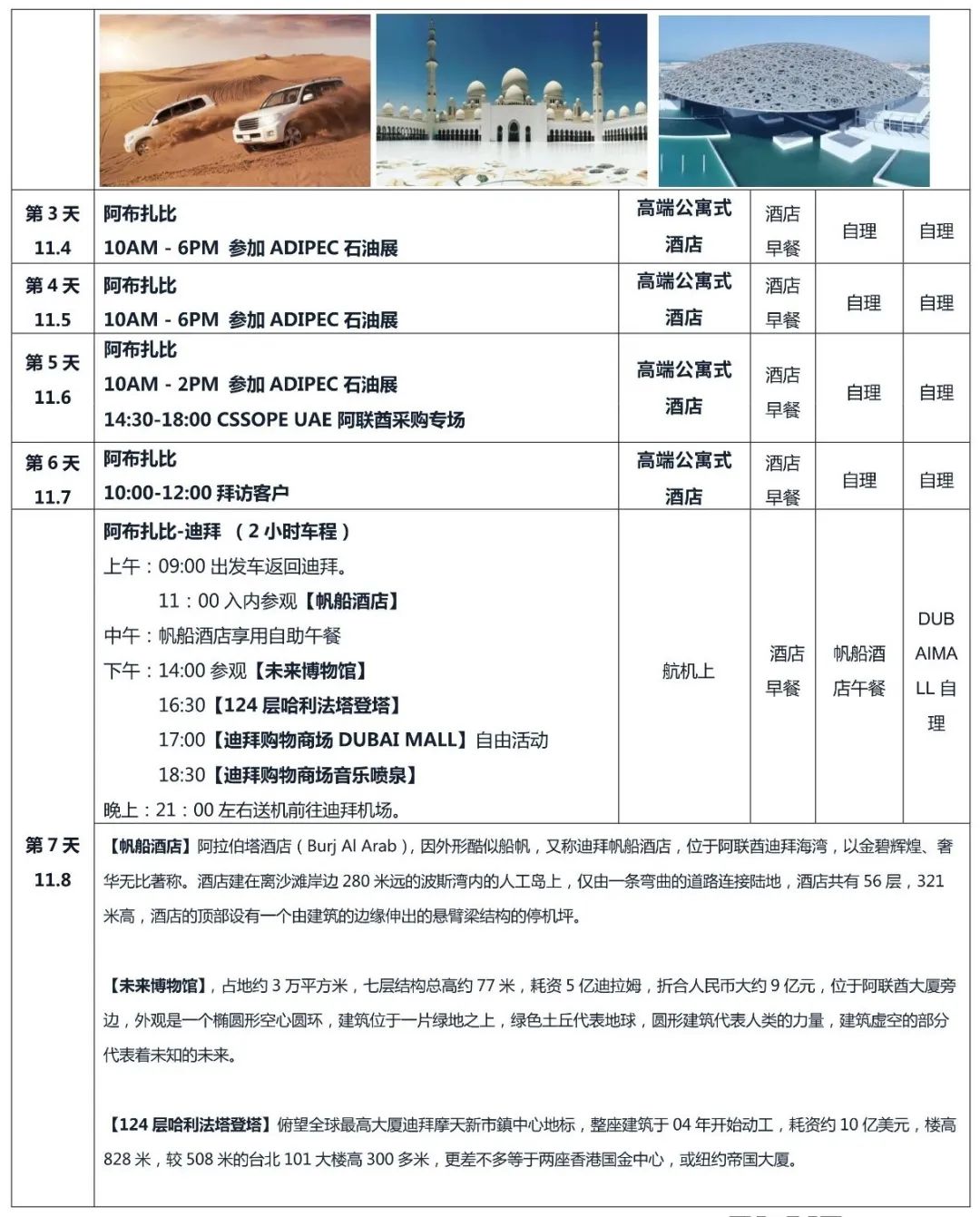 作为同期活动,由东方尚能咨询机构(TOPCO)举办的“第二届阿联酋采购专场 —— 中国石油化工装备采购国际峰会(CSSOPE UAE)”也将于11月6日在皇宫酒店召开。主办方将组织企业与ADNOC及NMDC等当地业主和EPC公司采购高层座谈、晚宴交流、一对一对接会、登门拜访等安排形式多样的对接活动,他们未来项目都会有向本次参会的中方企业倾斜机会。CSSOPE UAE 客户对接会是您参展ADIPEC期间最有效的客户对接方式,跟团报名即将截止,敬请联系抢定有限名额。详询 秦女士:158 0112 8545