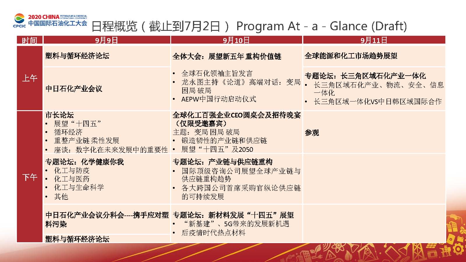您现在的位置是:首页 > 会议活动网站首页会议活动 2020 中国国际石油化工大会(CPCIC)介绍 管理员 2020-08-19 5855 次阅读 TAG: 无标签 上一篇:Topco与阿里巴巴联手打造第十届中国石油化工装备采购峰会暨展览会(CSSOPE 2020) 下一篇:CSSOPE重磅发言人:伊朗采购团确认演讲并采购石油设备 相关文章 特别推荐 【火爆出炉】CSSOPE 2025 全球采购对接会排期表 阅读 全球氢能项目大汇总,快来点击索要 阅读 随机推荐 科威特扩大3.8亿美元上游石油项目 生态环境部张大伟:VOCs治理已成为大气领域明显短板,... 2022-11-08 12:47:02 什么是“ 新质生产力产业链 ” 2024-06-06 17:32:00 埃克森美孚惠州乙烯项目全面开建 助力惠州打造世界级... 2021-11-25 09:00:04 塞内加尔多家大型石油企业面临资金紧张 2020-07-02 14:42:14 点击排行 【倒计时一周年】WGC2023,我在北京等你! 意大利塞班( SAIPEM)油气项目及采购计划:CSSOPE 为你解读 2019-03-14 15:21:04 集团公司召开2019年HSSE工作视频会议 2019-01-04 18:12:57 石油党员党建信息化平台交纳党费上亿元 2019-01-11 16:33:49 中国石油2022年集中采购招标公告 2022-02-11 20:43:22 标签 会议 中国石化新闻网 中国石油新闻中心 转载 原创 关注我们