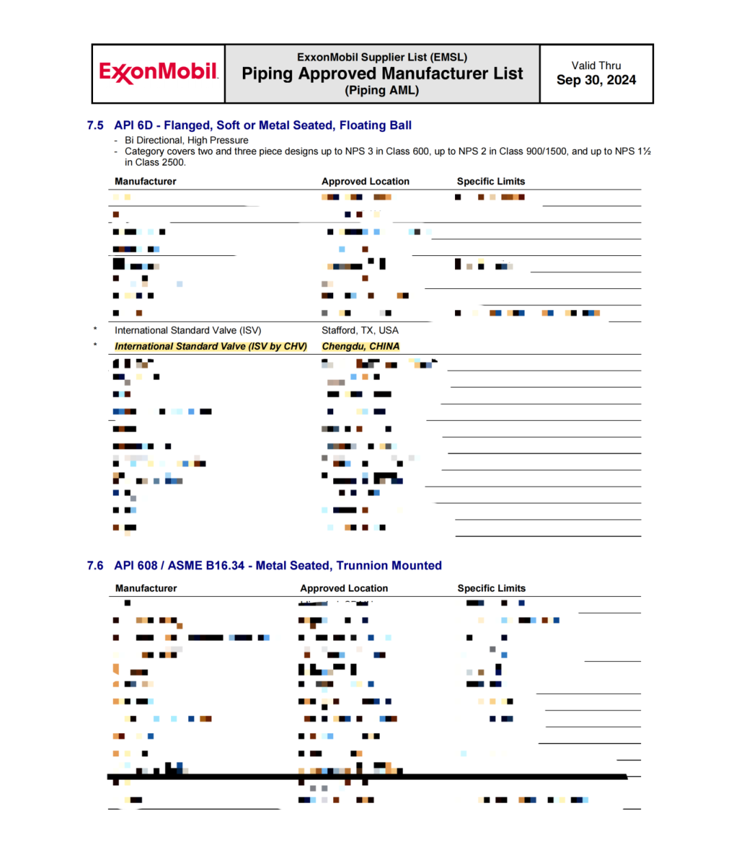 在美国埃克森美孚(ExxonMobil)最新发布的批准供应商列表(AML)中,成都成高阀门股份有限公司(CHV)在以下产品分类中获得正式批准: