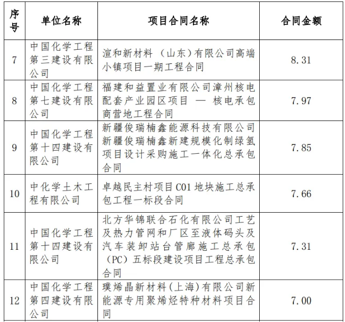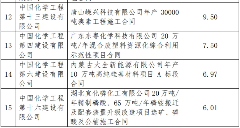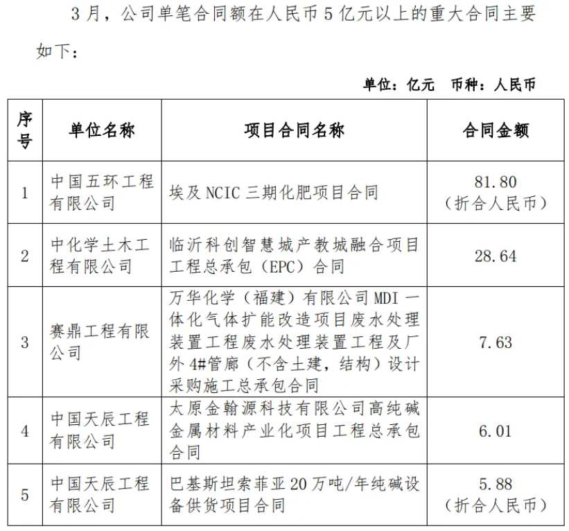 1-6月,中国化学共签订2749个项目,其中,单笔超过5亿元的项目有73个(具体清单见文章尾部),涉及包括万华化学、荣盛石化、湖北宜化、东粤化学、大全新能源、翔福新能源等多个巨头的项目,单笔最大金额高达81.8亿元,为中国五环在埃及签约的三期化肥项目总承包合同。