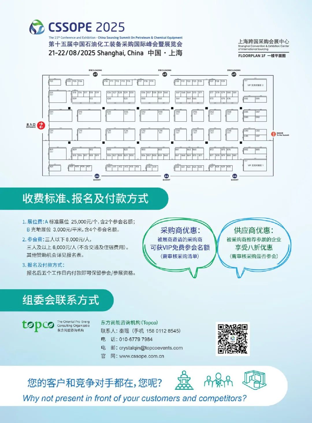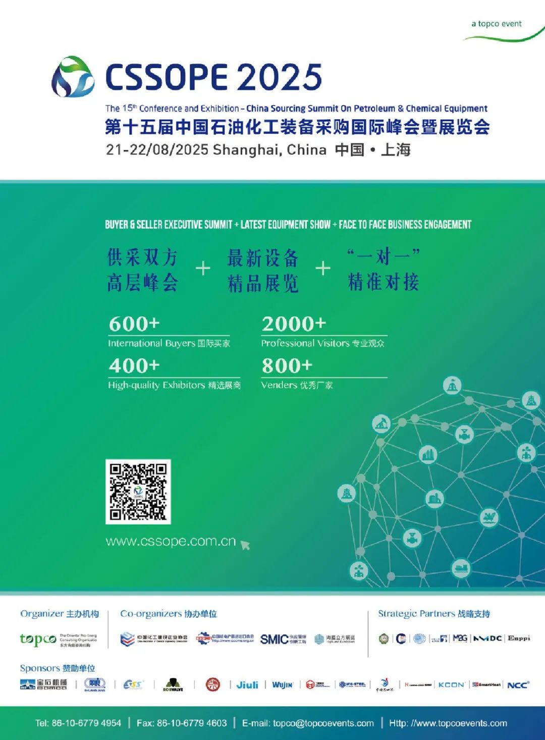 由东方尚能咨询机构(TOPCO)主办的“第十五届中国石油化工装备采购国际峰会暨展览会(CSSOPE 2025)”将于2025年8月21-22日在上海跨国采购中心一层举办!