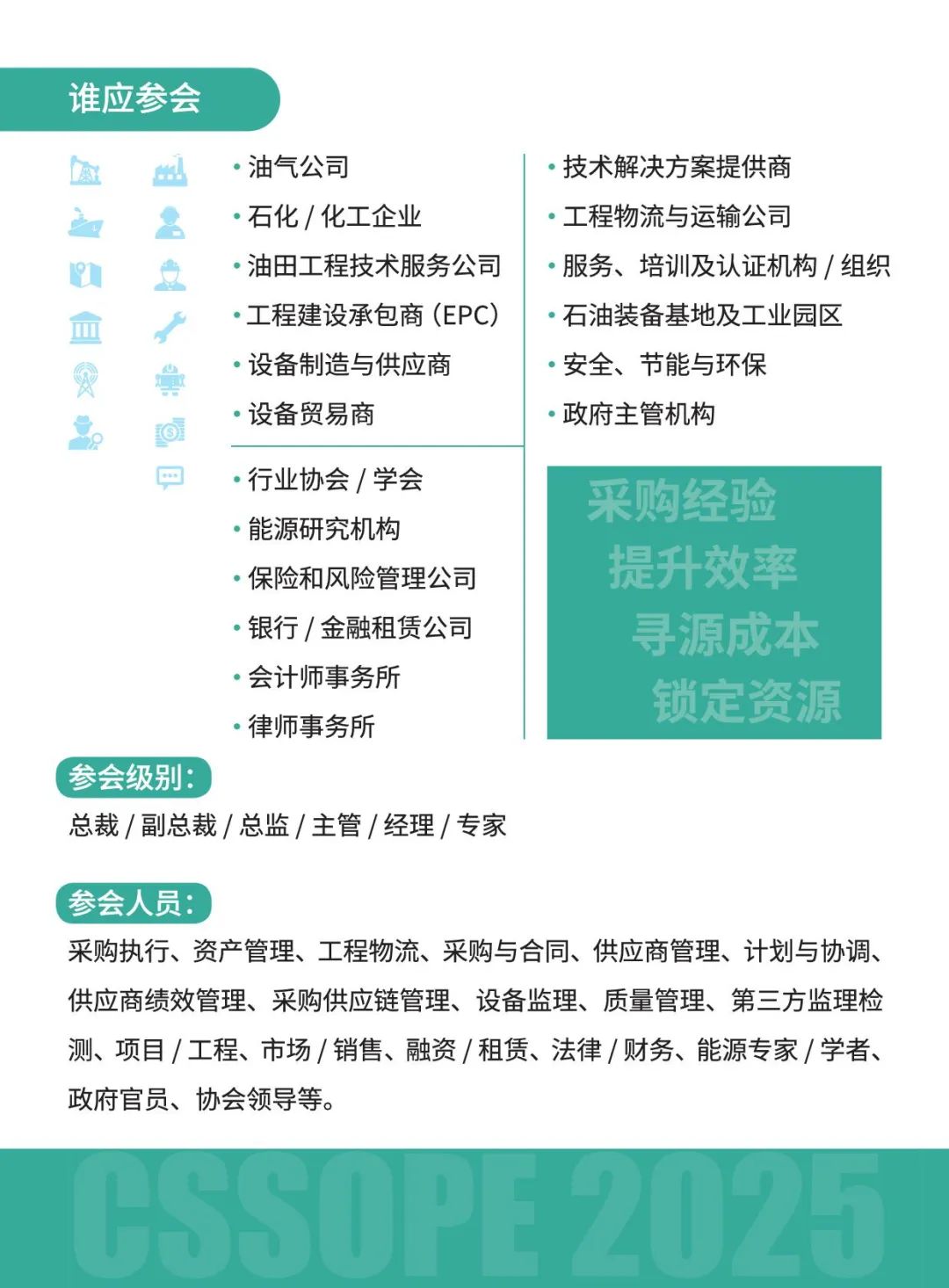 CSSOPE上海将聚焦油气上下游产业供应链,是供应商开发、采购商寻源、项目合作的专业平台。高质量的会议内容、优秀的供应商和服务商、知名的采购商和贸易商,确保了与会者高效的沟通和高质量的收益。