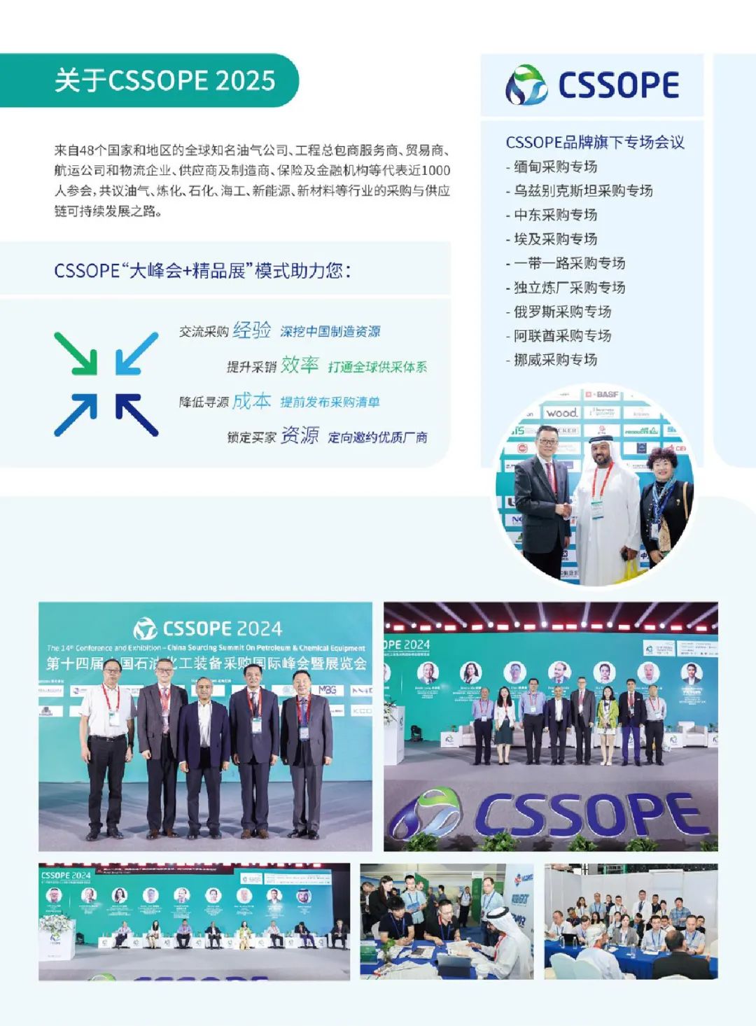 中国石油化工装备采购国际峰会(CSSOPE)是亚洲领先的石油化工装备采购盛会,每年举办一届,汇聚了来自全球的石油化工企业、工程公司、装备制造商和行业专家,为参会企业提供交流合作、共谋发展的平台。