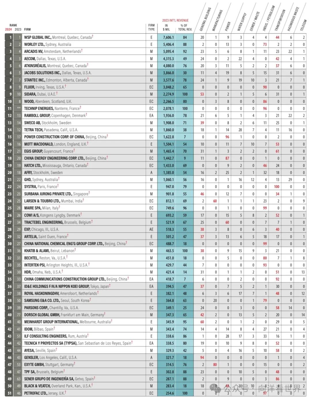 水务三强:STANTEC、WSP、嘉科(去年AECOM、STANTEC、TETRA(前年AECOM、STANTEC、嘉科),10强拿走TOP225国际营收的76.7%(去年70.9%)。