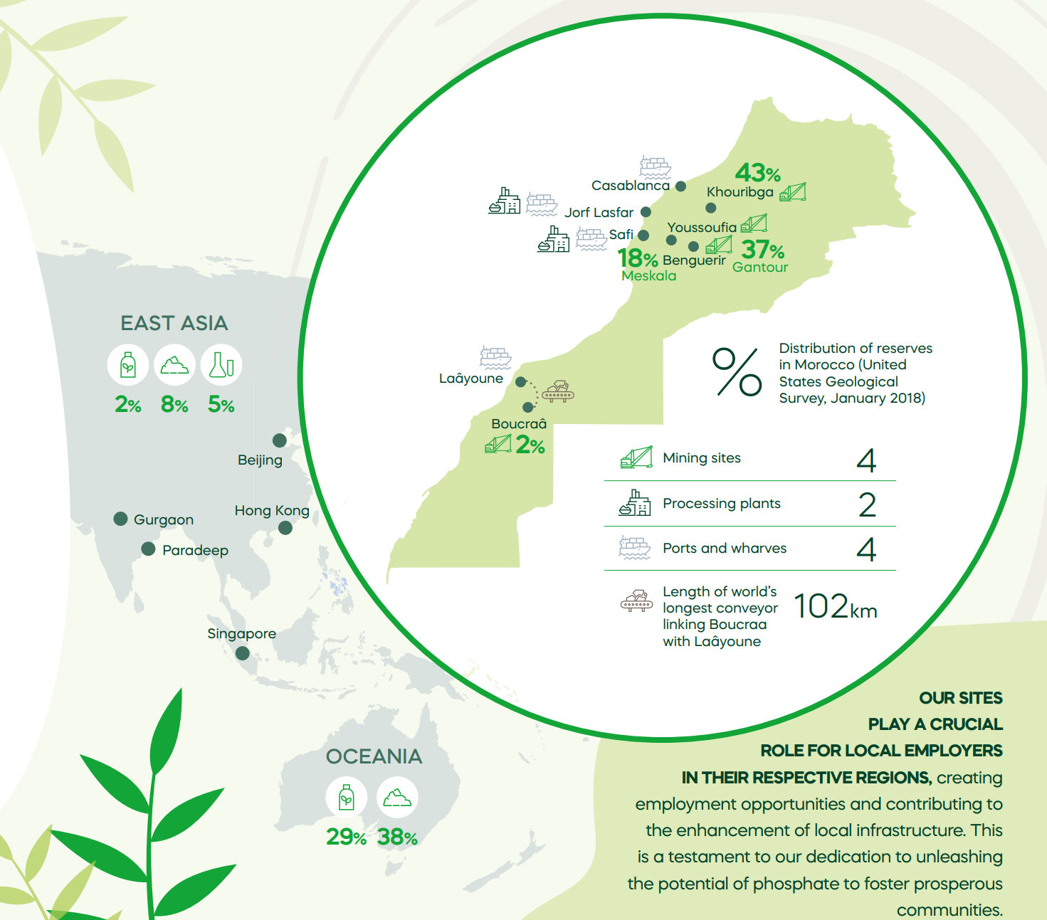 摩洛哥磷酸盐集团是全球领先的磷酸和磷酸衍生物生产企业,也是世界上最大的磷矿和磷酸出口企业之一,在全球磷化工产业中占据了不可替代的地位,其业务涵盖了整个磷酸盐价值链,包括磷酸盐及其衍生品的提取、运输和销售。