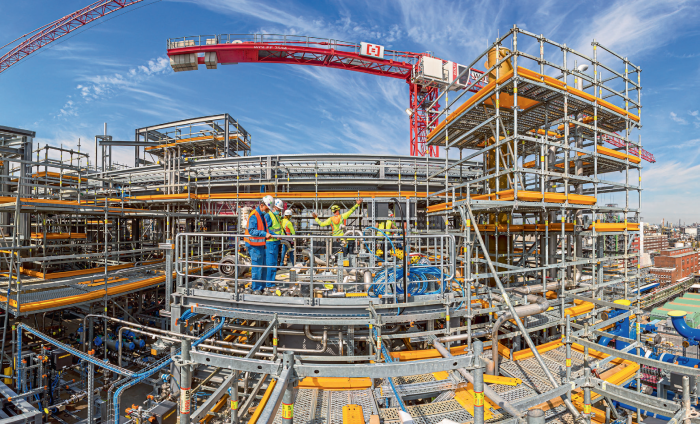 在德国路德维希港的巴斯夫建造新的建筑群,现代脚手架系统构成了大型工厂建设的中央通道系统,它们不仅提供通道和存储区域,而且还创造了适合为各个行业“协同作战”的工作环境,该工作环境还必须满足职业、安全和环境的所有要求