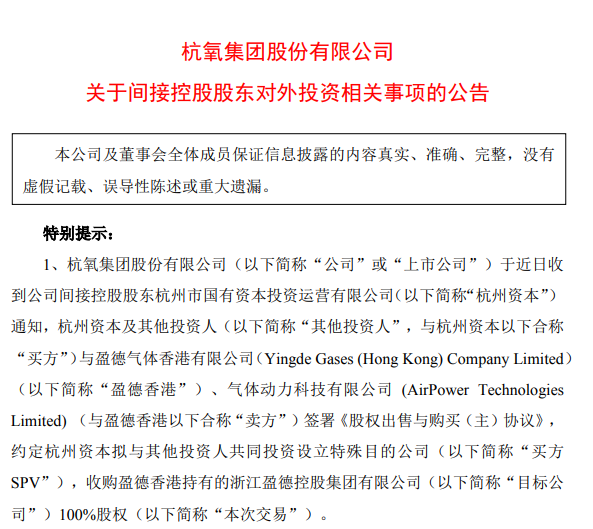 5月4日晚间,位居国内第五的工业气体公司杭氧股份公告,其间接控股股东杭州资本近日和其他投资人及盈德香港、气体动力,签署《股权出售与购买(主)协议》,约定杭州资本拟与其他投资人共同投资设立买方SPV,收购盈德香港持有的目标公司100%股权。