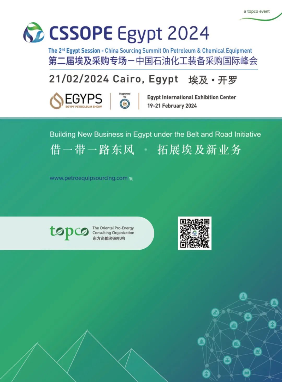 2024年2月21日在开罗举办的“埃及采购专场------中国石油化工装备采购国际峰会(CSSOPE Egypt 2024)”是CSSOPE在海外举办的专场采购峰会活动之一,2023年已经成功举办一届,邀请埃及油气领域主要业主、EPC、油服、贸易公司等客户主体参与会议,和中国优秀供应商进行一对一深入交流和精准对接,为中国供应商带来项目信息、人脉搭建、订单合作等,促进两国油气领域的交流合作。