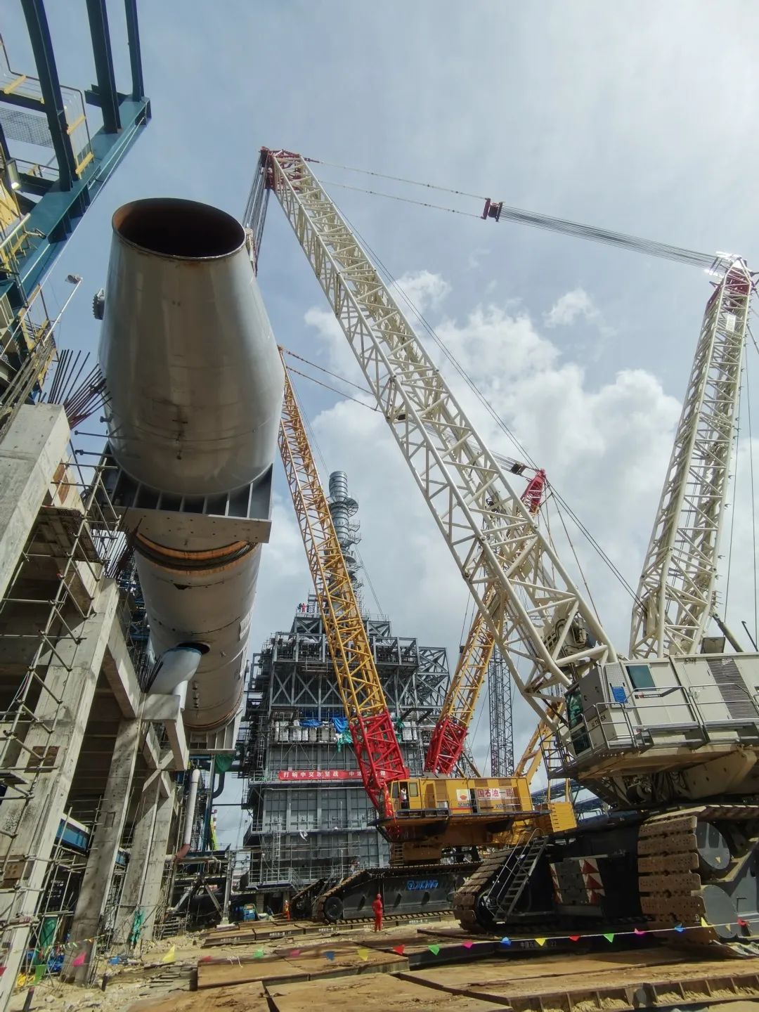 吊装现场,中油一建广东石化大件吊装项目团队使用4000吨和1600吨两台履带式起重机,采用“双主机直接提升法”,仅用时不到两个小时,设备稳稳就位。